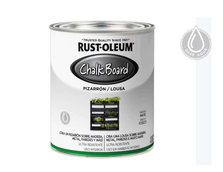 Rust-Oleum® ChalkBoard es un pintura que permite crear un pizarrón sobre prácticamente cualquier superficie u objeto. Su fórmula ultra resistente y de alta calidad permite lograr la superficie perfecta para escribir con tiza y borrar. Para madera, melamina, mampostería, vidrio, ¡y más! Su innovadora fórmula base agua, prácticamente sin olor, es de secado rápido y ofrece la conveniencia de poder lavar los elementos utilizados simplemente con agua y jabón. Ideal para proyectos de mayor tamaño, para pintar en ambientes en los que es complicado utilizar un producto en aerosol, o para aquellos que prioricen los beneficios de aplicar un producto base agua. Luego de aplicar, dejar secar la pintura el tiempo indicado en el envase. Antes de escribir por primera vez, prepare la superficie frotándola suavemente en su totalidad con el lateral de una tiza. Luego, ¡borra y listo! Ya estará listo para usar.